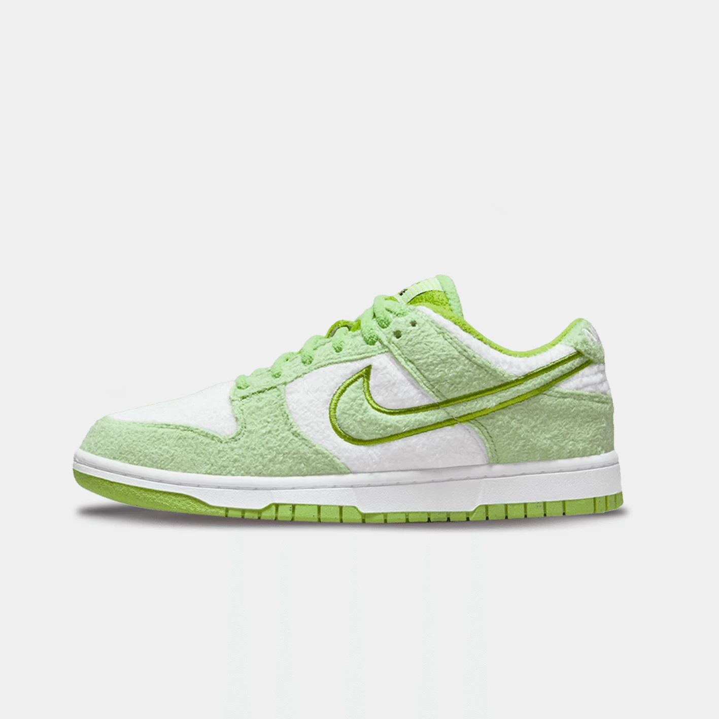 Der Nike Dunk Low Fleece Green präsentiert sich mit einem Fleece-Material, das sich über das gesamte Obermaterial erstreckt. Patellgrüne Einsätze fügen sich nahtlos in die weißen Bereiche ein. Diese harmonieren perfekt mit den Schnürsenkeln und der Zungenpartie. Das Ganze ruht auf einer weißen Sohle mit einer Nike Grind-Außensohle.